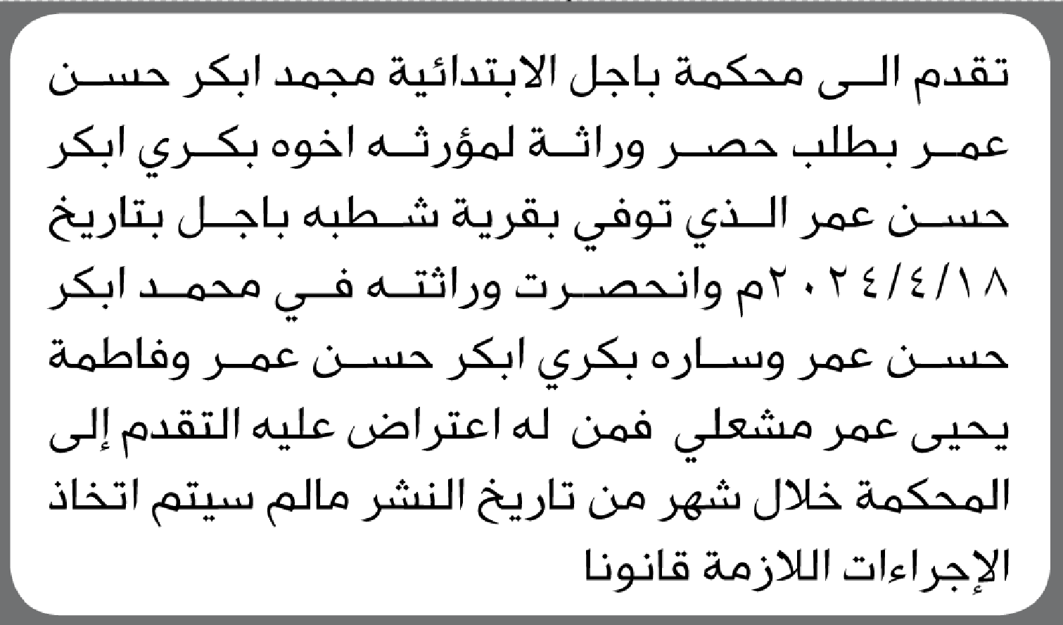 تعلن محكمة باجل أن الأح محمد أبكر حسن تقدم بدعوى انحصار وراثة إعلاناتمحاكم On يناير 6, 2026 Share Share FacebookTwitterWhatsAppTelegramGoogle+البريد الإلكترونيPrint