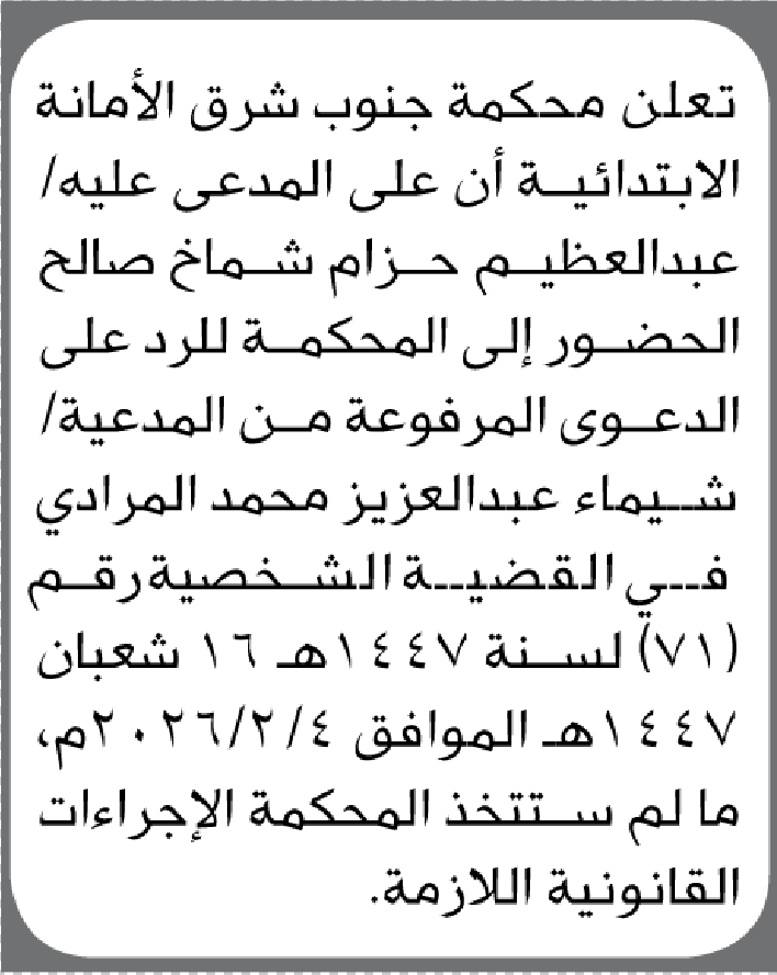 تعلن محكمة جنوب شرق الأمانة أن على المدعى عليه عبدالعظيم شماخ الحضور إلى المحكمة إعلاناتمحاكم On يناير 6, 2026 Share Share FacebookTwitterWhatsAppTelegramGoogle+البريد الإلكترونيPrint