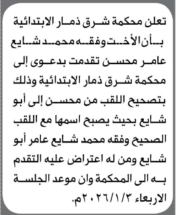 تعلن محكمة شرق ذمار أن الأخت وفقه محمد شايع تقدمت بطلب تصحيح اسمها إعلاناتمحاكم On يناير 6, 2026 Share Share FacebookTwitterWhatsAppTelegramGoogle+البريد الإلكترونيPrint