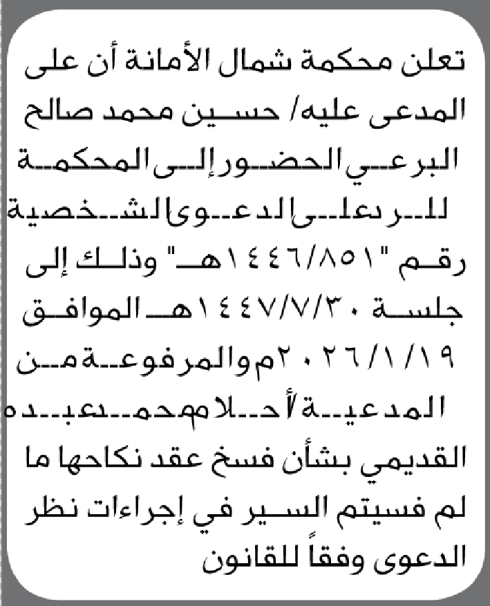 تعلن محكمة شمال الأمانة أن على المدعى عليه حسين محمد البرعي الحضور إلى المحكمة إعلاناتمحاكم On يناير 6, 2026 Share Share FacebookTwitterWhatsAppTelegramGoogle+البريد الإلكترونيPrint