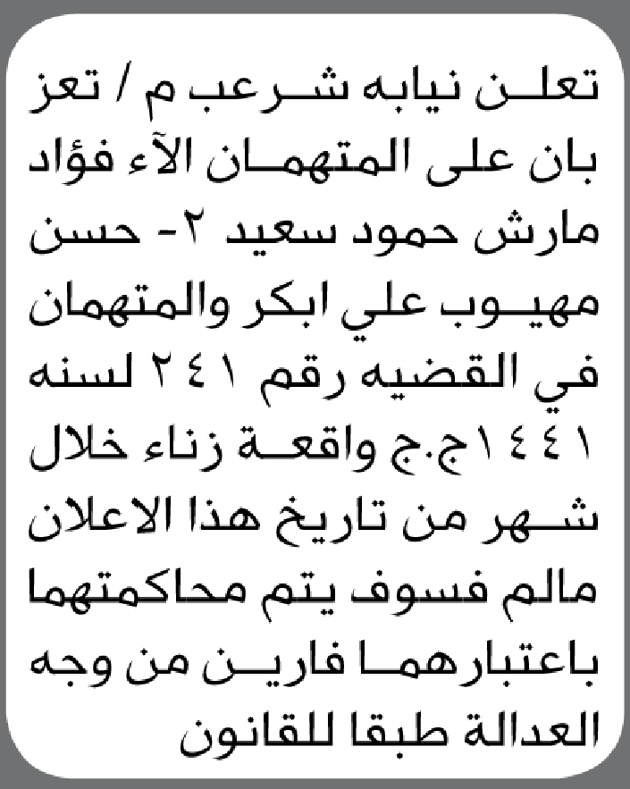 تعلن نيابة شرعب أن على المتهمان الحضور الى المحكمة إعلاناتمحاكم On يناير 6, 2026 Share Share FacebookTwitterWhatsAppTelegramGoogle+البريد الإلكترونيPrint