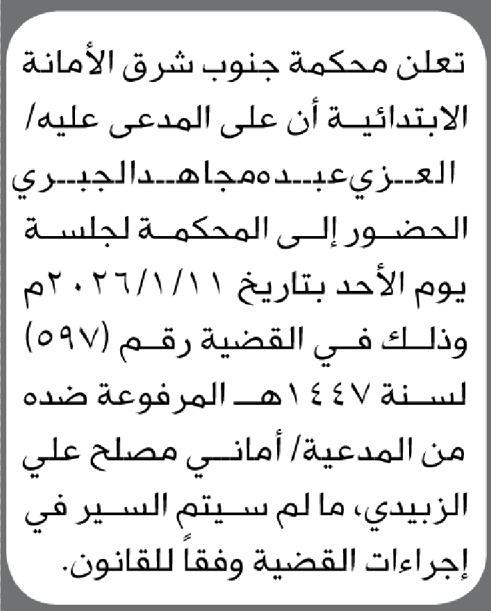 تعلن محكمة جنوب شرق الأمانة أن على المدعى عليه العزي الجبري الحضور الى المحكمة إعلاناتمحاكم On يناير 6, 2026 Share Share FacebookTwitterWhatsAppTelegramGoogle+البريد الإلكترونيPrint