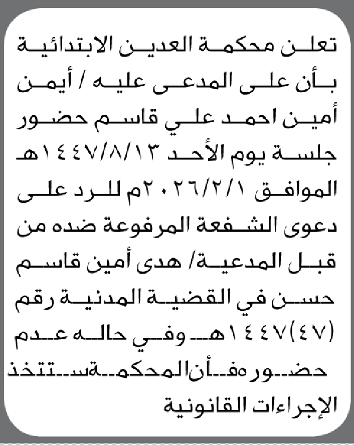 تعلن محكمة العدين أن على المدعى عليه أيمن قاسم الحضور الى المحكمة إعلاناتمحاكم On يناير 6, 2026 Share Share FacebookTwitterWhatsAppTelegramGoogle+البريد الإلكترونيPrint