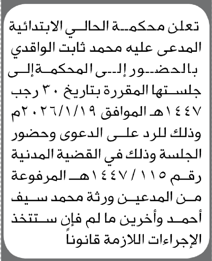 تعلن محكمة الحالي أن على المجعى عليه محمد الواقدي الحضور الى المحكمة إعلاناتمحاكم On يناير 6, 2026 Share Share FacebookTwitterWhatsAppTelegramGoogle+البريد الإلكترونيPrint