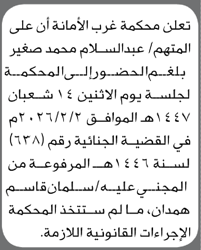 تعلن محكمة غرب الأمانة أن على المتهم عبدالسلام بلغم الحضور الى المحكمة إعلاناتمحاكم On يناير 6, 2026 Share Share FacebookTwitterWhatsAppTelegramGoogle+البريد الإلكترونيPrint