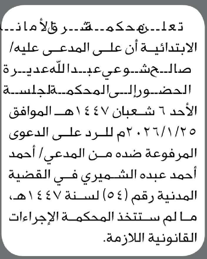 تعلن محكمة شرق الأمانة أن على صالح شوعي الحضور الى المحكمة إعلاناتمحاكم On يناير 6, 2026 Share Share FacebookTwitterWhatsAppTelegramGoogle+البريد الإلكترونيPrint