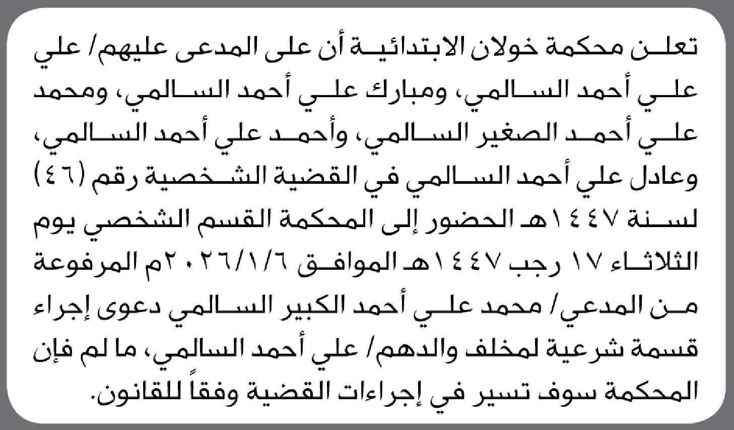 تعلن محكمة خولان الابتدائية بأن على/علي أحمد السامعي وآخرين الحضور إلى المحكمة إعلاناتمحاكم On يناير 6, 2026 Share Share FacebookTwitterWhatsAppTelegramGoogle+البريد الإلكترونيPrint