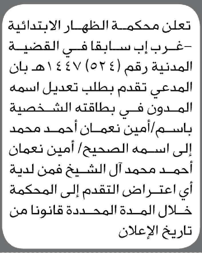 تعلن محكمة الظهار الابتدائية بأن الأخ/ أمين نعمان تقدم إليها بطلب تعديل اسمه إعلاناتمحاكم On يناير 6, 2026 Share Share FacebookTwitterWhatsAppTelegramGoogle+البريد الإلكترونيPrint