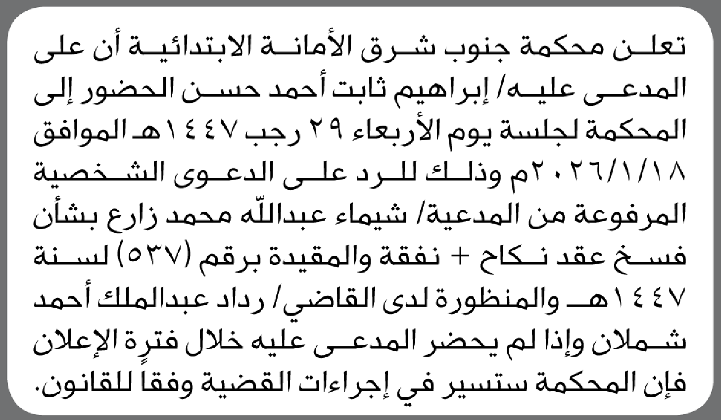 تعلن محكمة جنوب شرق الأمانة بأن على/ إبراهيم ثابت حسن الحضور إلى المحكمة إعلاناتمحاكم On يناير 6, 2026 Share Share FacebookTwitterWhatsAppTelegramGoogle+البريد الإلكترونيPrint