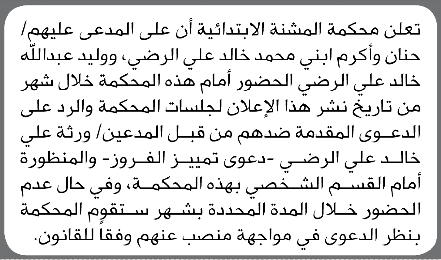 تعلن محكمة المشنة الابتدائية بأن على/ حنان محمد الرضي وآخرين الحضور إلى المحكمة إعلاناتمحاكم On يناير 6, 2026 Share Share FacebookTwitterWhatsAppTelegramGoogle+البريد الإلكترونيPrint
