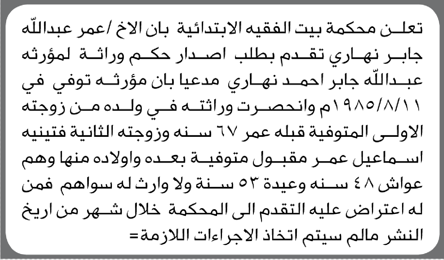 تعلن محكمة بيت الفقية الابتدائية بأن الأخ/ عمر عبدالله نهاري تقدم إليها بطلب اصدار حكم وراثة إعلاناتمحاكم On يناير 6, 2026 Share Share FacebookTwitterWhatsAppTelegramGoogle+البريد الإلكترونيPrint