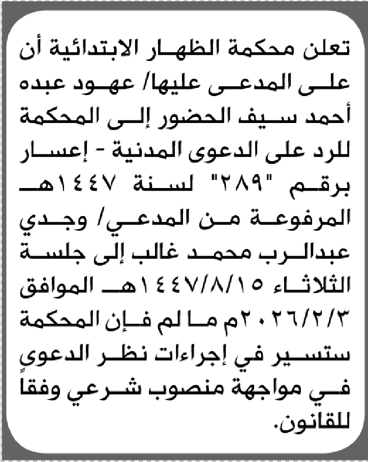 تعلن محكمة الظهار أن على المدعى عليها عهود سيف الحضور الى المحكمة إعلاناتمحاكم On يناير 7, 2026 Share Share FacebookTwitterWhatsAppTelegramGoogle+البريد الإلكترونيPrint