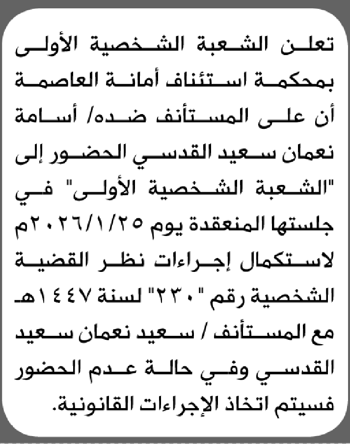 تعلن محكمة استئناف الأمانة أن على اسامة القدسي الحضور ال المحكمة إعلاناتمحاكم On يناير 7, 2026 Share Share FacebookTwitterWhatsAppTelegramGoogle+البريد الإلكترونيPrint