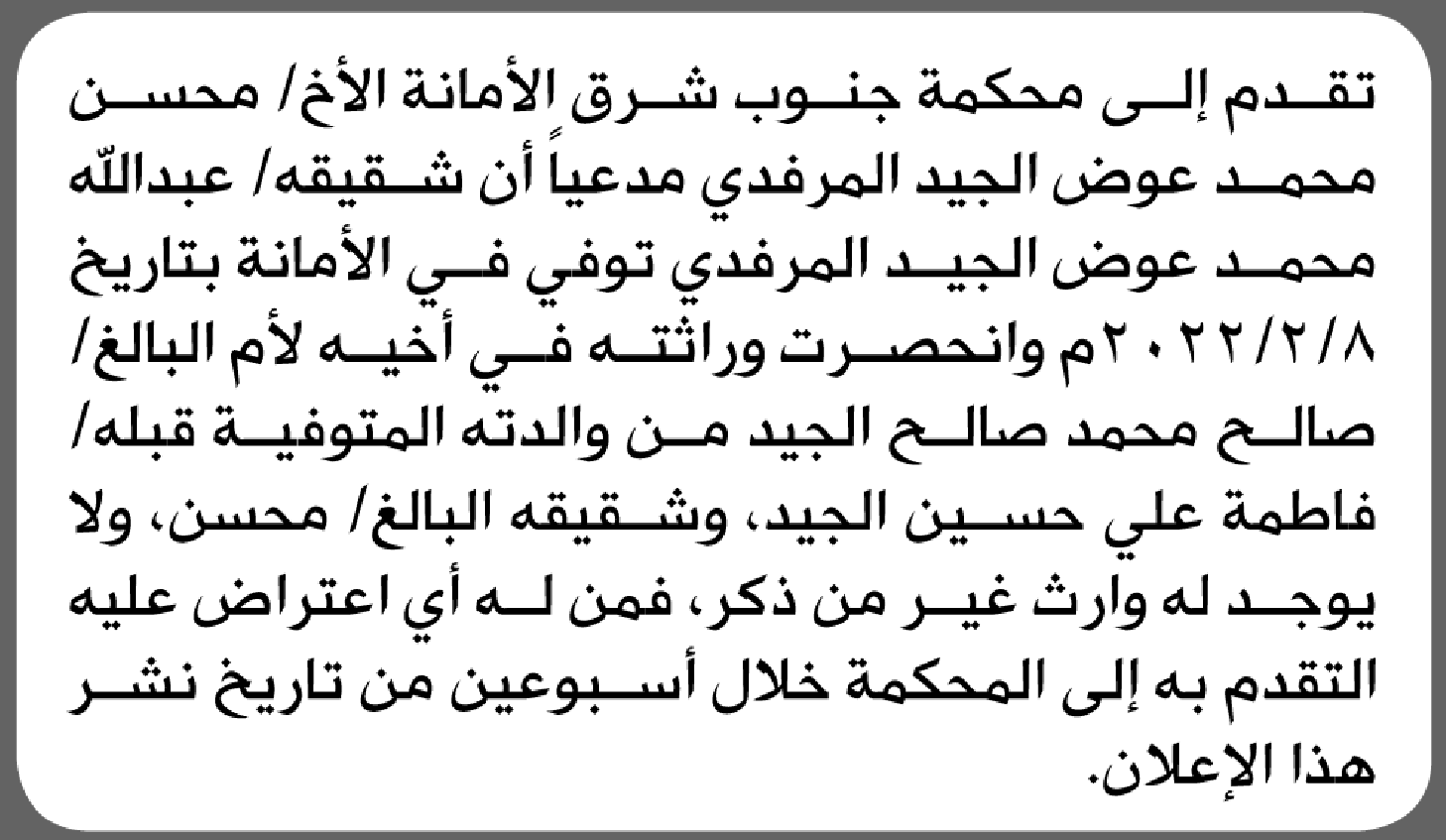 تعلن محكمة جنوب شرق الأمانة بأن الأخ/ محسن محمد المرفدي تقدم إليها بطلب انحصار وراثة إعلاناتمحاكم On يناير 7, 2026 Share Share FacebookTwitterWhatsAppTelegramGoogle+البريد الإلكترونيPrint