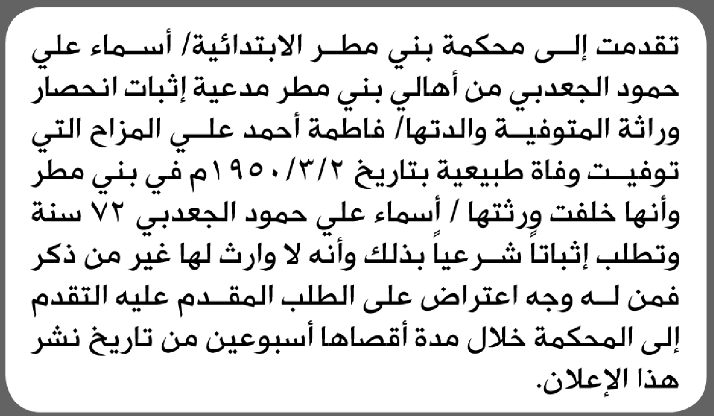تعلن محكمة بني مطر أن الأخت أسماء الجعدبي تقدمت بدعوى انحصار وراثة إعلاناتمحاكم On يناير 7, 2026 Share Share FacebookTwitterWhatsAppTelegramGoogle+البريد الإلكترونيPrint