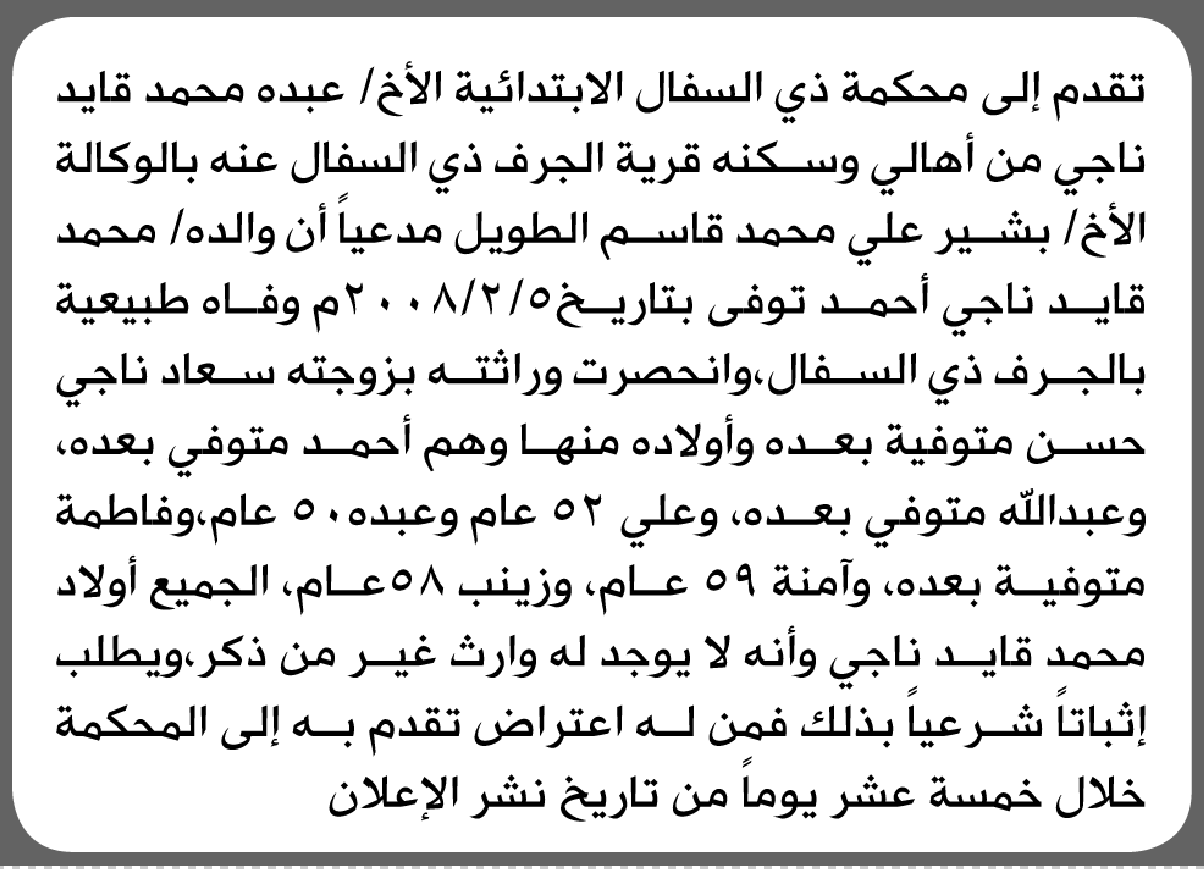 تعلن محكمة ذي السفال أن الأخ عبده محمد قايد تقدم بدعوى انحصار وراثة إعلاناتمحاكم On يناير 7, 2026 Share Share FacebookTwitterWhatsAppTelegramGoogle+البريد الإلكترونيPrint