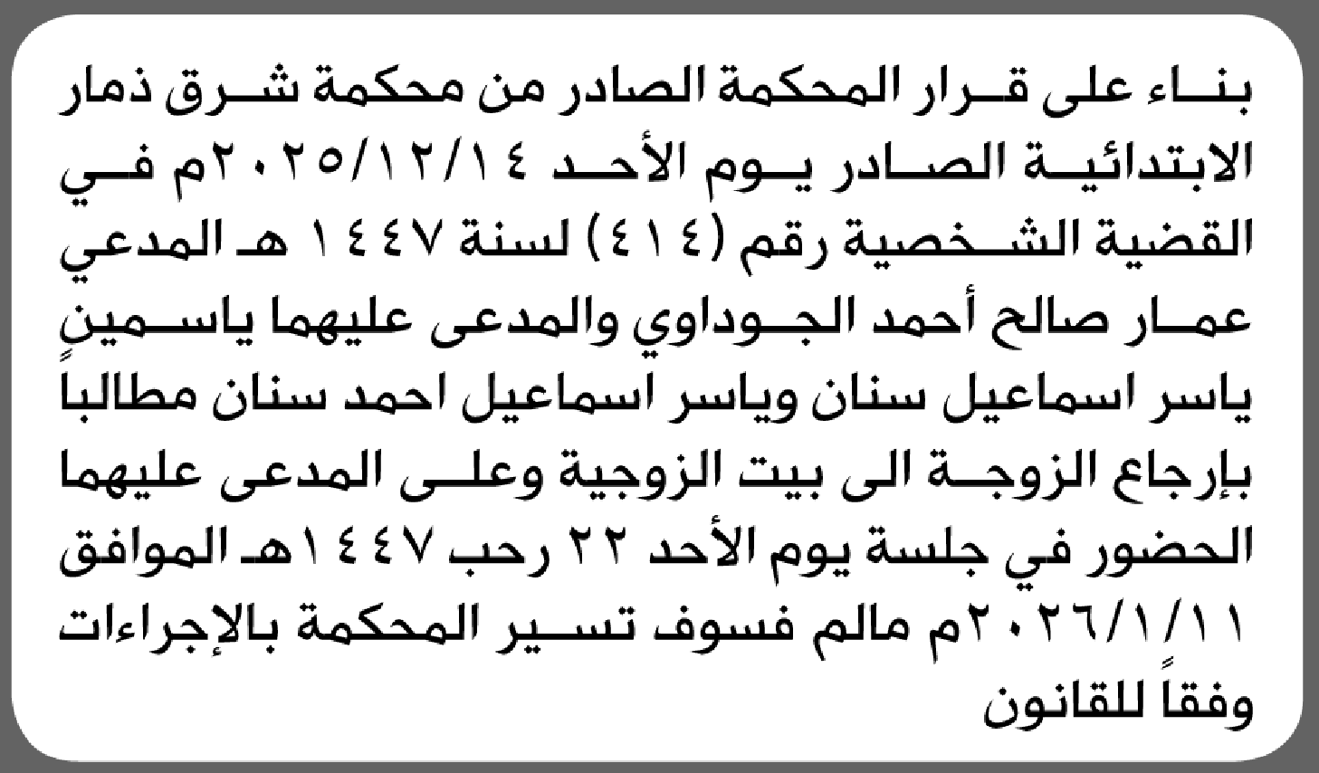 تعلن محكمة شرق ذمار أن على المدعى عليهما ياسمين سنان وياسر سنان الحضور إلى المحكمة إعلاناتمحاكم On يناير 7, 2026 Share Share FacebookTwitterWhatsAppTelegramGoogle+البريد الإلكترونيPrint