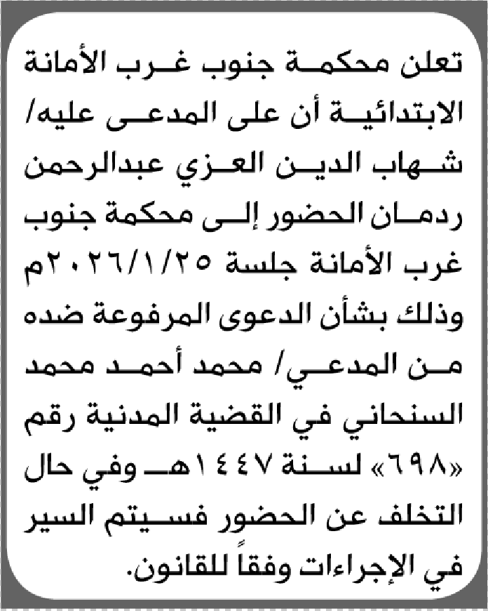 تعلن محكمة جنوب غرب الأمانة أن على المدعى عليه شهاب الدين ردمان الحضور إلى المحكمة إعلاناتمحاكم On يناير 8, 2026 Share Share FacebookTwitterWhatsAppTelegramGoogle+البريد الإلكترونيPrint