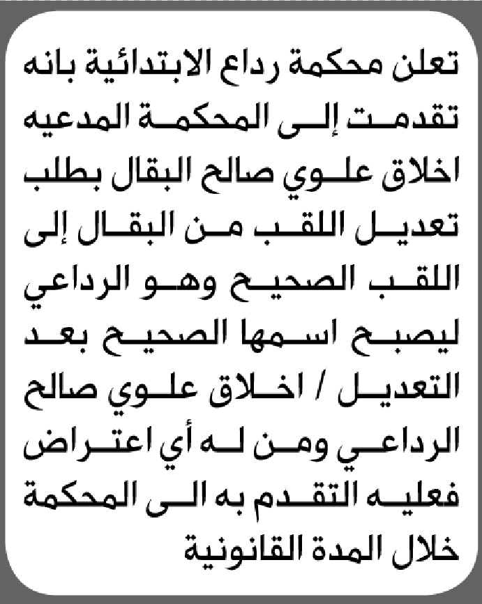 تعلن محكمة رداع أن الأخت أخلاق علوي البقال تقدمت بطلب تصحيح اسمها إعلاناتمحاكم On يناير 8, 2026 Share Share FacebookTwitterWhatsAppTelegramGoogle+البريد الإلكترونيPrint