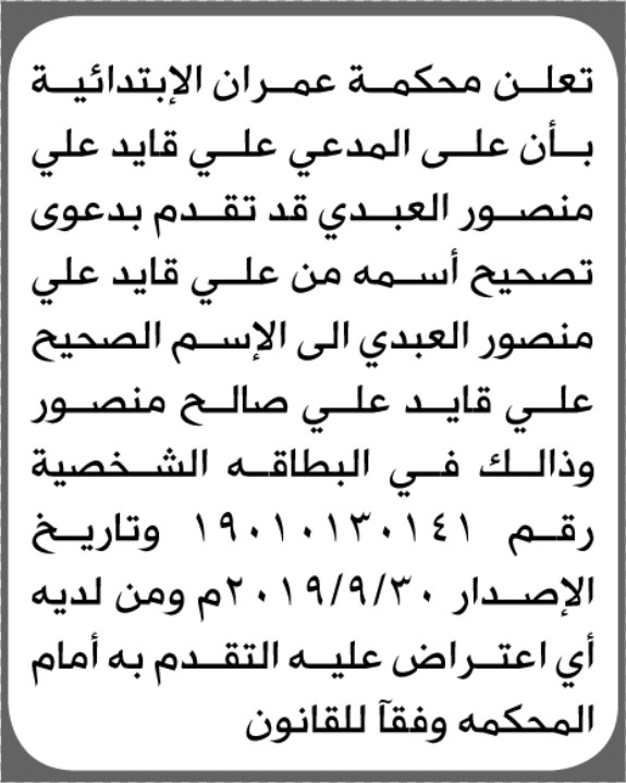 تعلن محكمة عمران الابتدائية بأن الأخ/ علي قايد العبدي تقدم إليها بطلب تصحيح اسمه إعلاناتمحاكم On يناير 9, 2026 Share Share FacebookTwitterWhatsAppTelegramGoogle+البريد الإلكترونيPrint