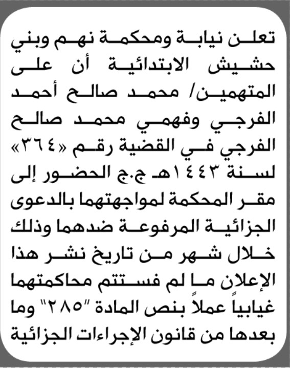 تعلن محكمة نهم وبني حشيش الابتدائية بأن على/ محمد وفهمي الفرجي الحضور إلى المحكمة إعلاناتمحاكم On يناير 9, 2026 Share Share FacebookTwitterWhatsAppTelegramGoogle+البريد الإلكترونيPrint