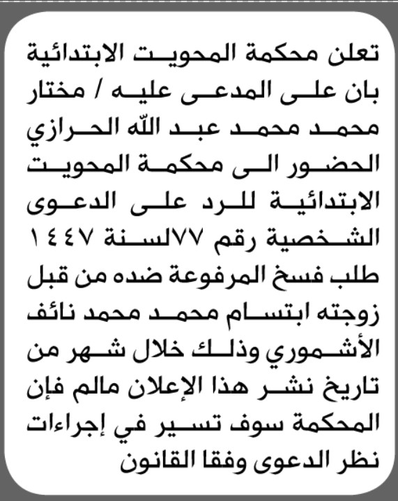 تعلن محكمة المحويت أن على المدعى عليه مختار محمد الحرازي الحضور إلى المحكمة إعلاناتمحاكم On يناير 9, 2026 Share Share FacebookTwitterWhatsAppTelegramGoogle+البريد الإلكترونيPrint