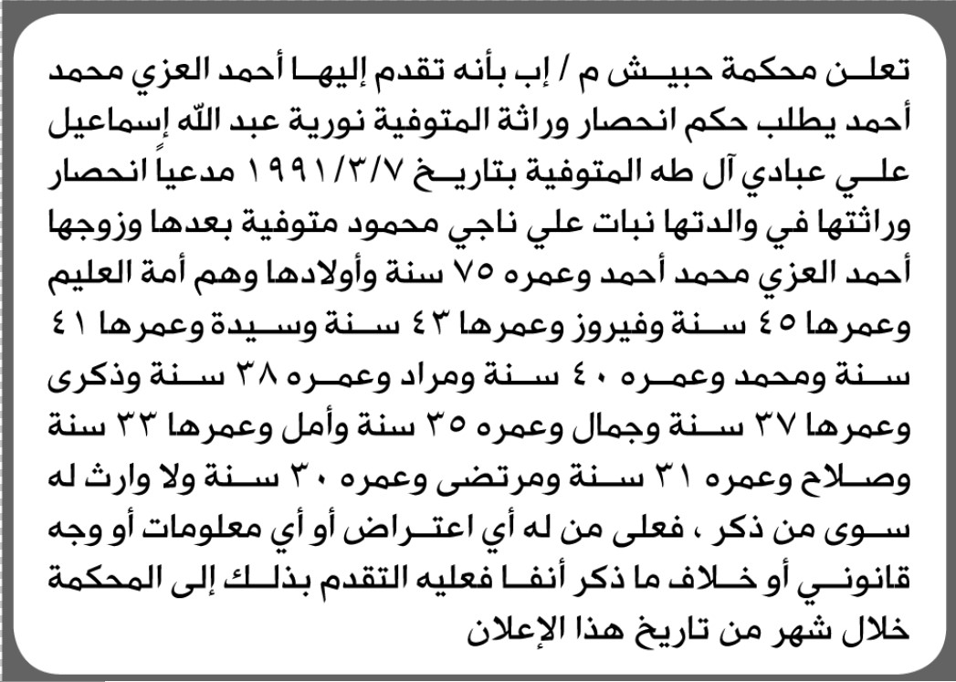 تعلن محكمة حبيش أن الأخ أحمد العزي تقدم بدعوى انحصار وراثة إعلاناتمحاكم On يناير 9, 2026 Share Share FacebookTwitterWhatsAppTelegramGoogle+البريد الإلكترونيPrint