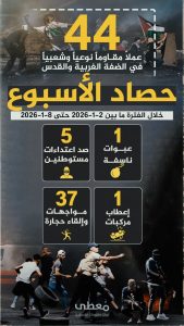 قال مركز معلومات فلسطين (معطى)، اليوم الجمعة، إن الضفة الغربية والقدس المحتلة، شهدتا خلال الأسبوع الماضي 44 عملاً مقاوماً نوعياً وشعبياً، وذلك خلال الفترة ما بين 2 وحتى 8 يناير الجاري.