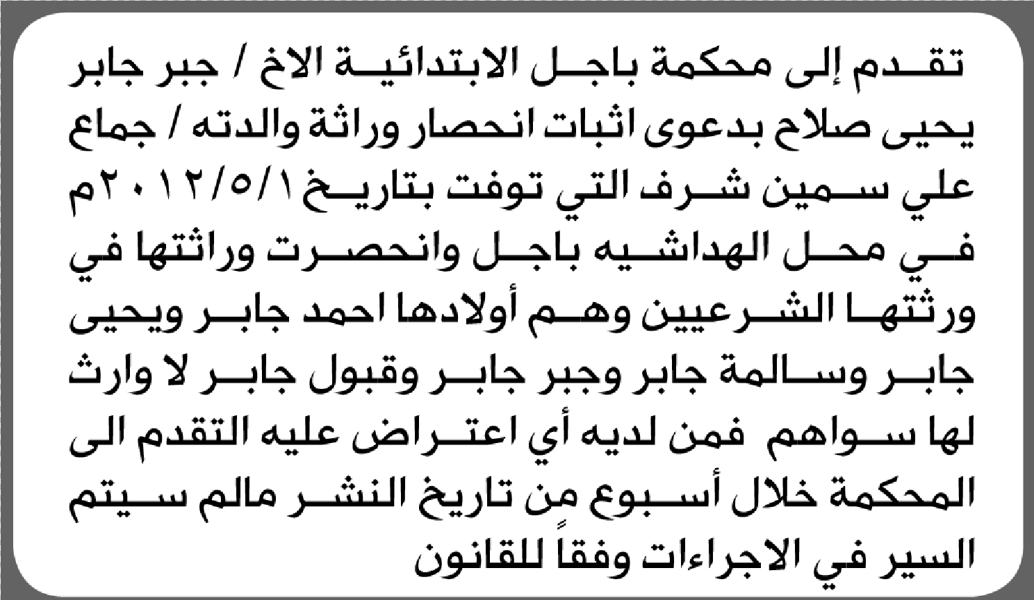 تقدم الى محكمة باجل جبر جابر بطلب انحصار وراثة إعلاناتمحاكم On يناير 10, 2026 Share Share FacebookTwitterWhatsAppTelegramGoogle+البريد الإلكترونيPrint