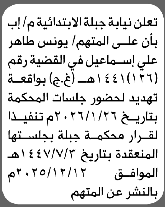 تعلن محكمة جبلةم/إب بأن على يونس طاهر الحضور الى المحكمة إعلاناتمحاكم On يناير 10, 2026 Share Share FacebookTwitterWhatsAppTelegramGoogle+البريد الإلكترونيPrint