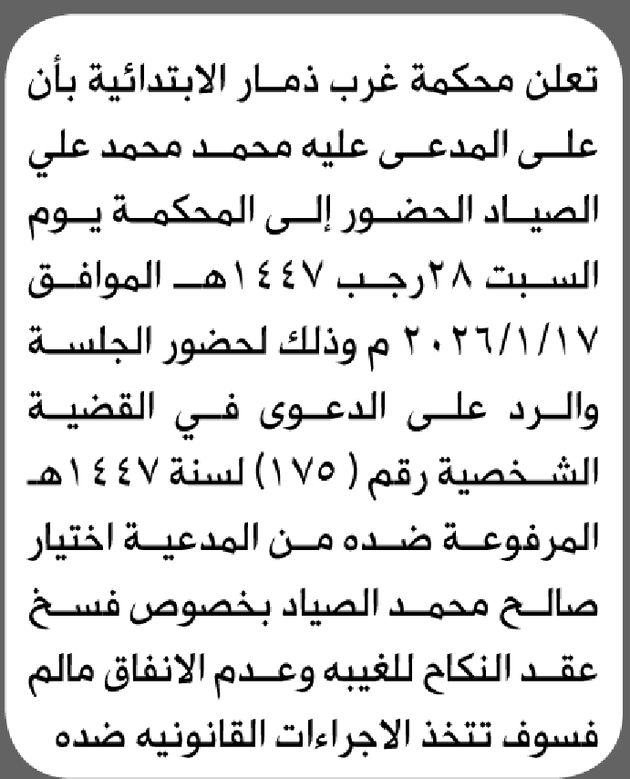 تعلن محكمة غرب ذمار بأن على محمد الصياد الحضور الى جلسة المحكمة إعلاناتمحاكم On يناير 10, 2026 Share Share FacebookTwitterWhatsAppTelegramGoogle+البريد الإلكترونيPrint