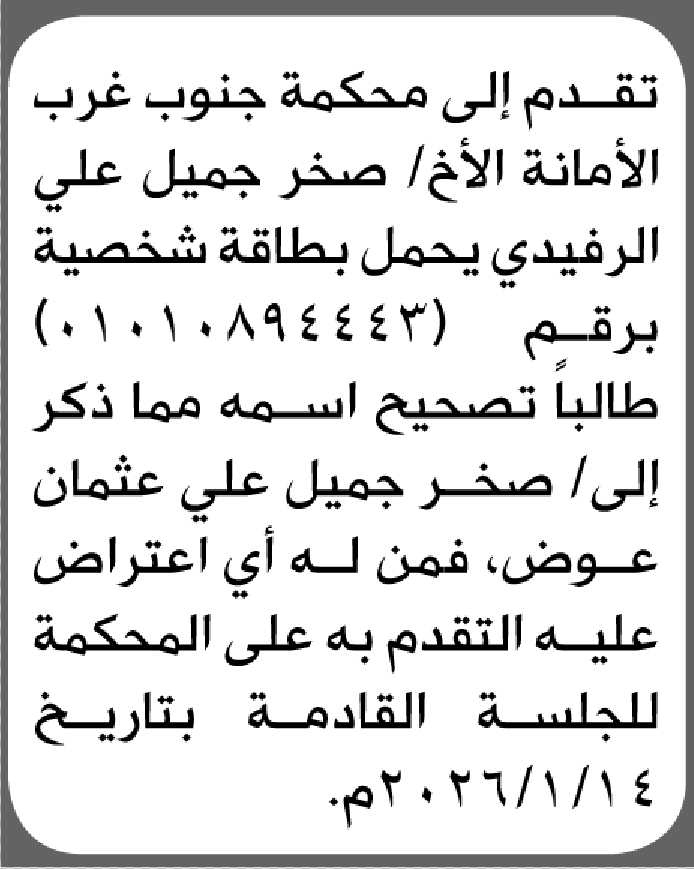 تقدم الى محكمة جنوب غرب الأمانة صخر الرفيدي بطلب تصحيح اسم إعلاناتمحاكم On يناير 10, 2026 Share Share FacebookTwitterWhatsAppTelegramGoogle+البريد الإلكترونيPrint