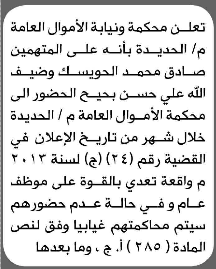 تعلن محكمة ونيابة الأموال العامة م/الحديده بان على المتهمين الحضور الى المحكمة إعلاناتمحاكم On يناير 10, 2026 Share Share FacebookTwitterWhatsAppTelegramGoogle+البريد الإلكترونيPrint
