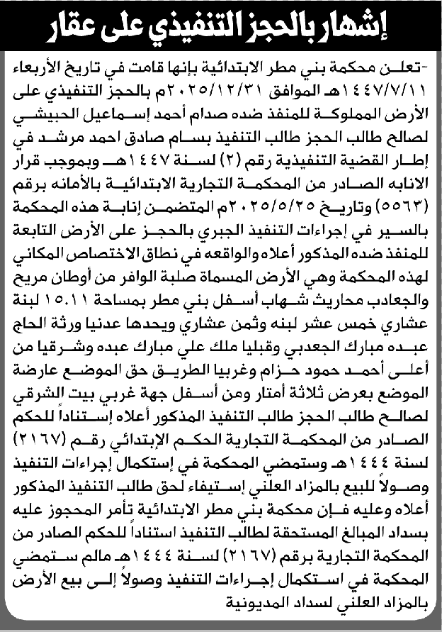 تعلن محكمة بني مطر عن حجز الأرض التابعة للمنفذ ضده صدام أحمد الحبيشي إعلاناتمحاكم On يناير 10, 2026 Share Share FacebookTwitterWhatsAppTelegramGoogle+البريد الإلكترونيPrint