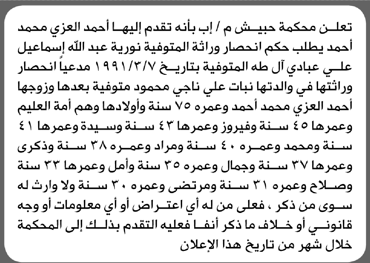 تعلن محكمة حبيش أن الأخ أحمد العزي تقدم بدعوى انحصار وراثة إعلاناتمحاكم On يناير 10, 2026 Share Share FacebookTwitterWhatsAppTelegramGoogle+البريد الإلكترونيPrint