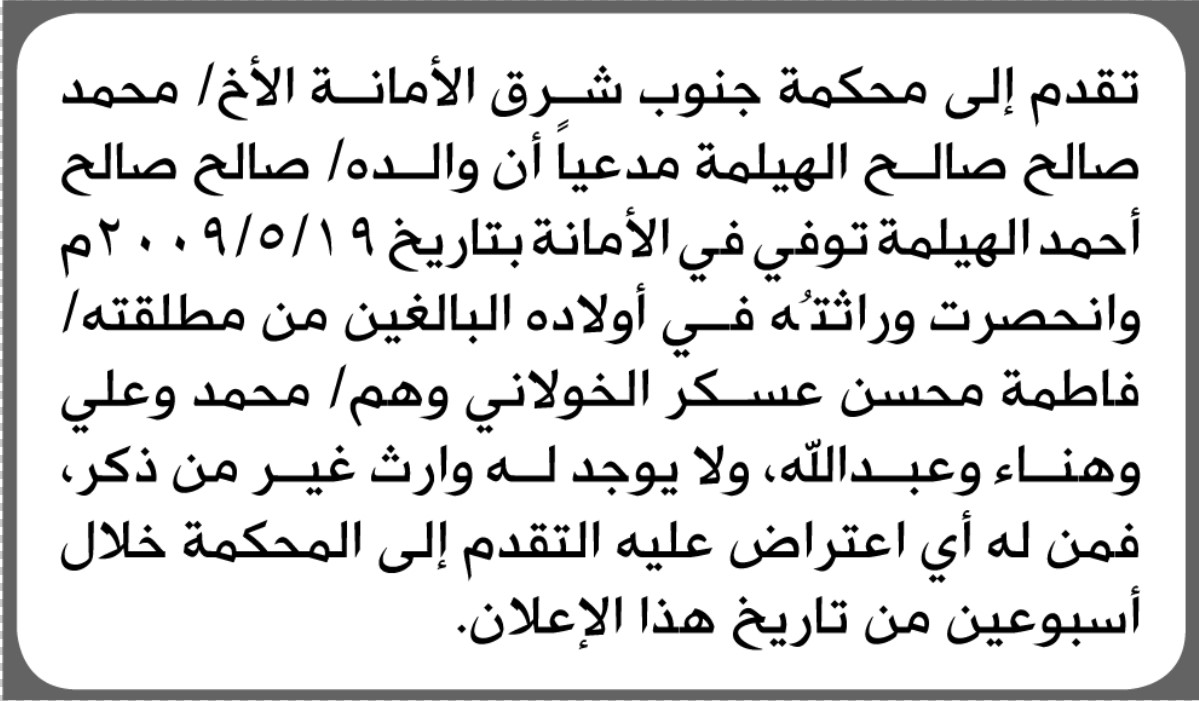 تعلن محكمة جنوب شرق الأمانة أن الأخ محمد الهيلمة تقدم بدعوى انحصار وراثة إعلاناتمحاكم On يناير 11, 2026 Share Share FacebookTwitterWhatsAppTelegramGoogle+البريد الإلكترونيPrint