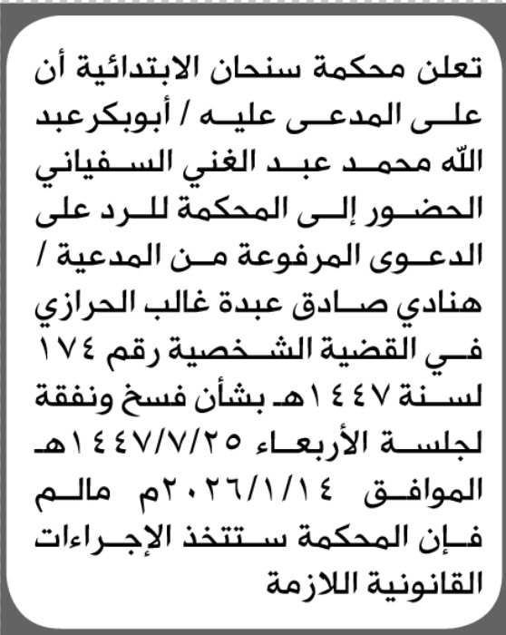 تعلن محكمة سنحان أن على المدعى عليه أبوبكر عبدالله السفياني الحضور إلى المحكمة إعلاناتمحاكم On يناير 11, 2026 Share Share FacebookTwitterWhatsAppTelegramGoogle+البريد الإلكترونيPrint