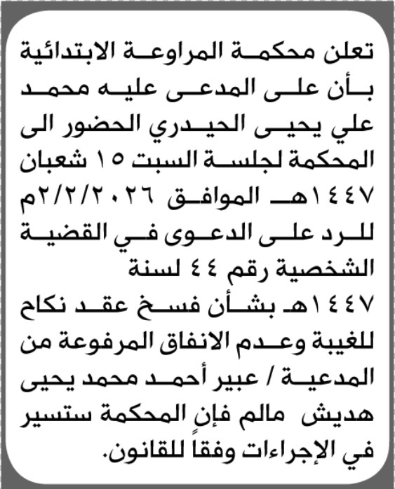 تعلن محكمة المراوعة أن على المدعى عليه محمد الحيدري الحضور إلى المحكمة إعلاناتمحاكم On يناير 11, 2026 Share Share FacebookTwitterWhatsAppTelegramGoogle+البريد الإلكترونيPrint
