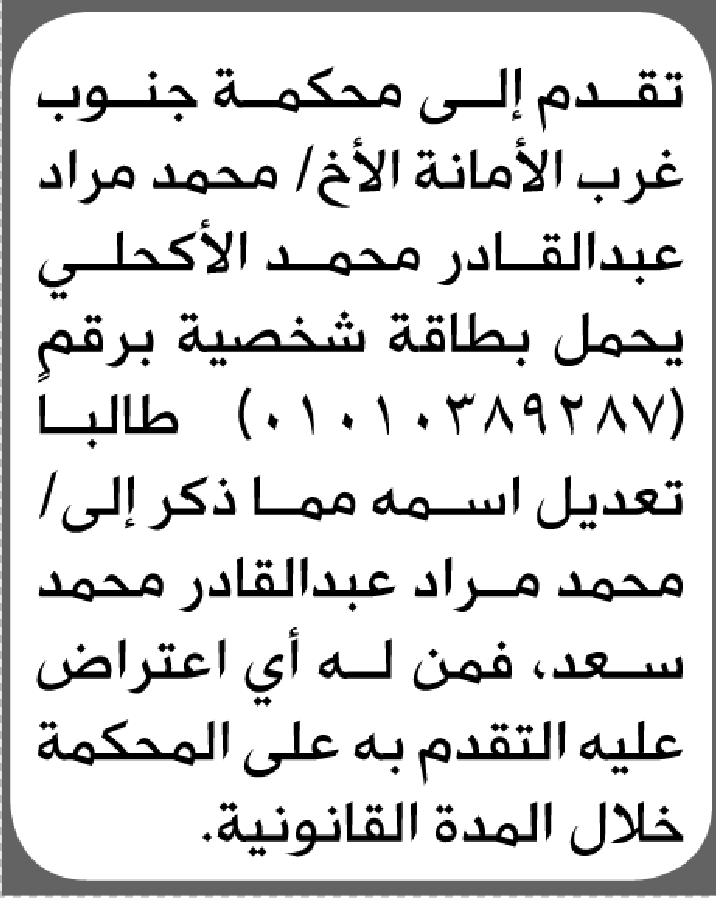 تعلن محكمة جنوب غرب الأمانة بأن الأخ/ محمد مراد الأكحلي تقدم إليها بطلب تعديل اسمه إعلاناتمحاكم On يناير 12, 2026 Share Share FacebookTwitterWhatsAppTelegramGoogle+البريد الإلكترونيPrint