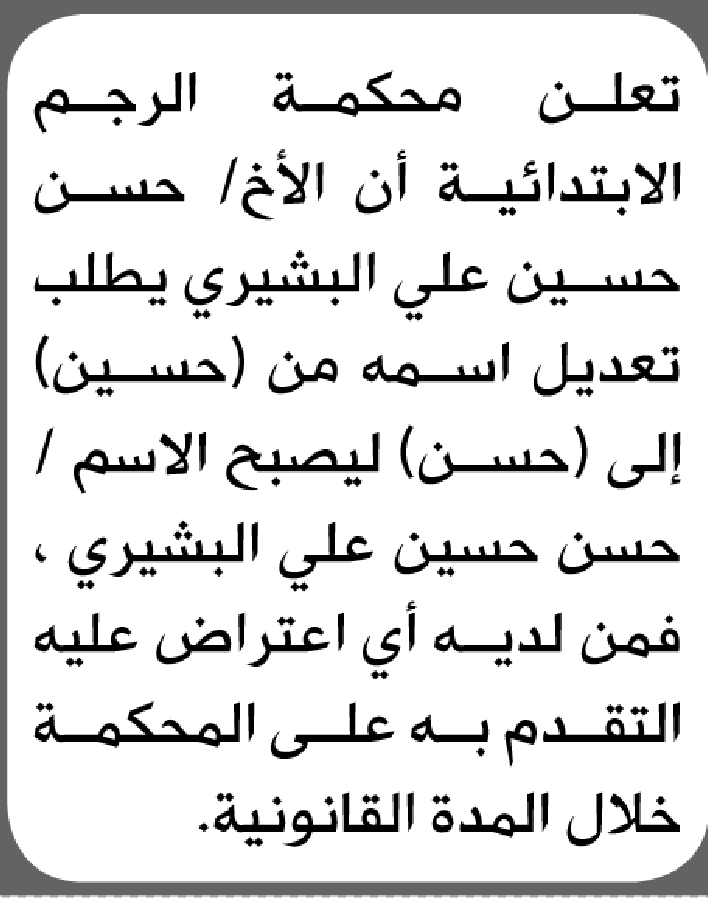 تعلن محكمة الرجم الابتدائية بأن الأخ/ حسن حسين البشيري تقدم إليها بطلب تعديل اسمه إعلاناتمحاكم On يناير 12, 2026 Share Share FacebookTwitterWhatsAppTelegramGoogle+البريد الإلكترونيPrint