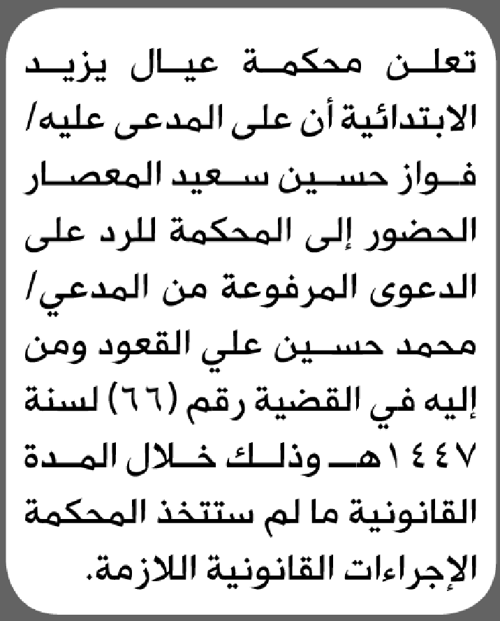 تعلن محكمة عيال زايد ان على فواز المعصار الحضور الى المحكمة إعلاناتمحاكم On يناير 12, 2026 Share Share FacebookTwitterWhatsAppTelegramGoogle+البريد الإلكترونيPrint