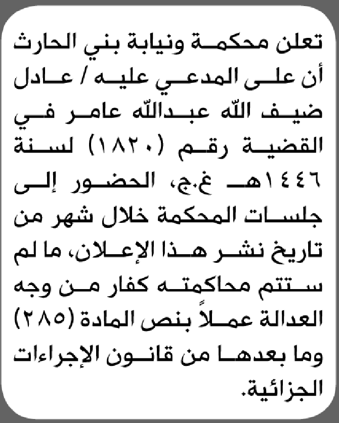 تعلن محكمة بني الحارث الابتدائية بأن على/ عادل ضيف الله عامر الحضور إلى المحكمة إعلاناتمحاكم On يناير 13, 2026 Share Share FacebookTwitterWhatsAppTelegramGoogle+البريد الإلكترونيPrint
