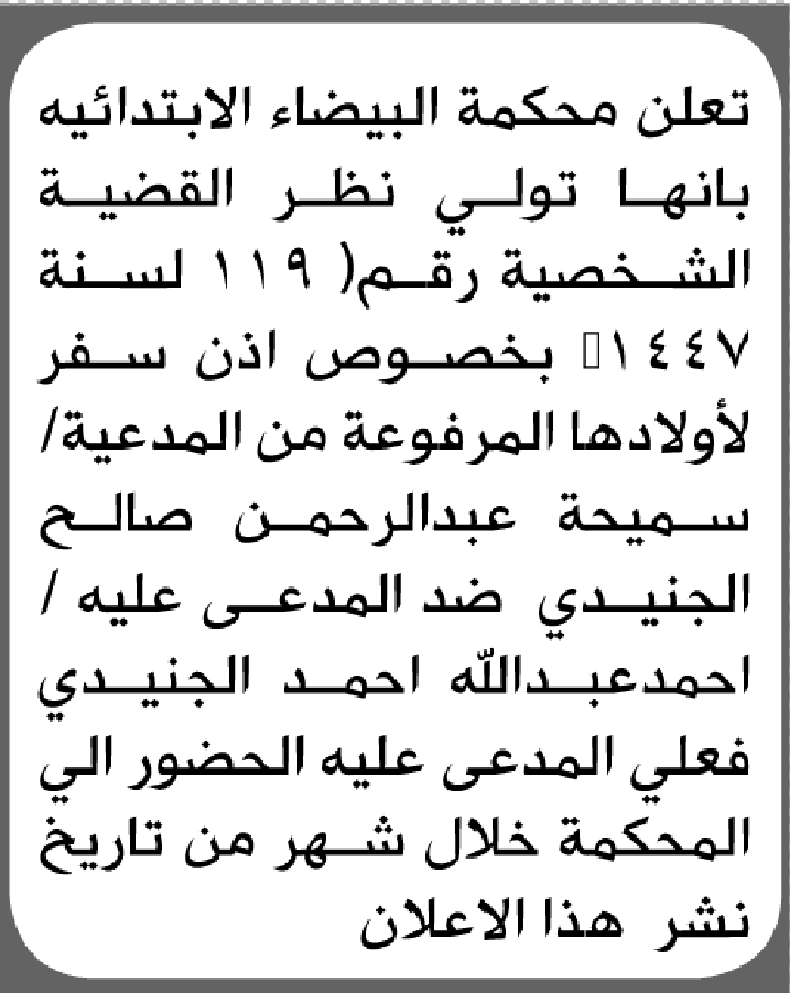 تعلن محكمة البيضاء أن على المدعى عليه أحمد الجنيدي الحضور إلى المحكمة إعلاناتمحاكم On يناير 14, 2026 Share Share FacebookTwitterWhatsAppTelegramGoogle+البريد الإلكترونيPrint