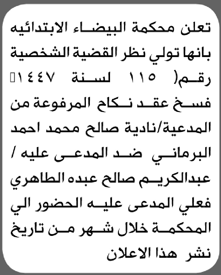 تعلن محكمة البيضاء أن على المدعى عليه عبدالكريم الطاهري الحضور إلى المحكمة إعلاناتمحاكم On يناير 14, 2026 Share Share FacebookTwitterWhatsAppTelegramGoogle+البريد الإلكترونيPrint