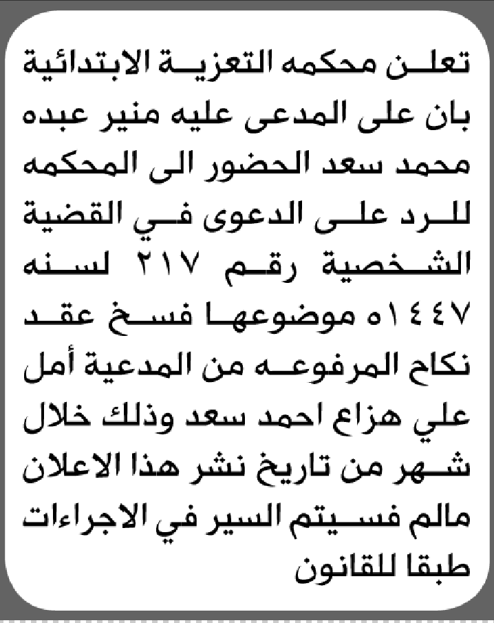تعلن محكمة التعزية أن على المدعى عليه منير عبده محمد الحضور إلى المحكمة إعلاناتمحاكم On يناير 15, 2026 Share Share FacebookTwitterWhatsAppTelegramGoogle+البريد الإلكترونيPrint