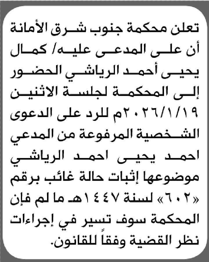 تعلن محكمة جنوب شرق الأمانة أن على المدعى عليه كمال الرياشي الحضور إلى المحكمة إعلاناتمحاكم On يناير 15, 2026 Share Share FacebookTwitterWhatsAppTelegramGoogle+البريد الإلكترونيPrint