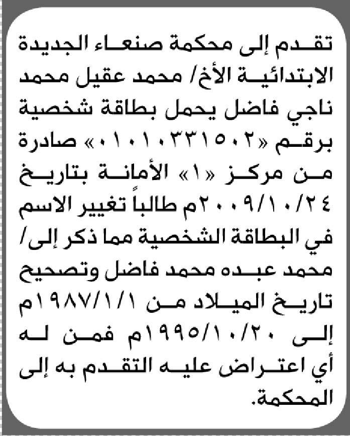 تعلن محكة صنعاء الجديدة بأن الأخ/ محمد عقيل فاضل تقدم إليها بطلب تغيير اسمه إعلاناتمحاكم On يناير 16, 2026 Share Share FacebookTwitterWhatsAppTelegramGoogle+البريد الإلكترونيPrint