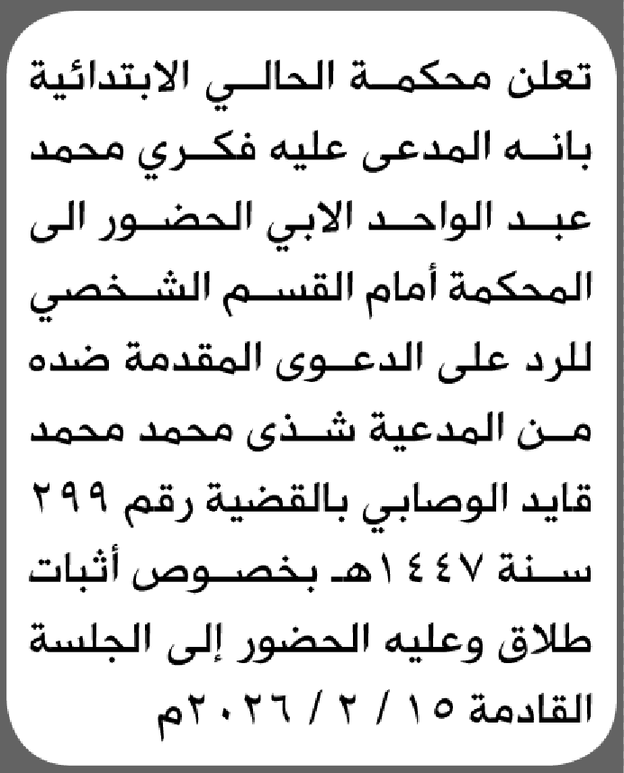 تعلن محكمة الحالي الابتدائية بأن على/ فكري محمد الابي الحضور إلى المحكمة إعلاناتمحاكم On يناير 16, 2026 Share Share FacebookTwitterWhatsAppTelegramGoogle+البريد الإلكترونيPrint