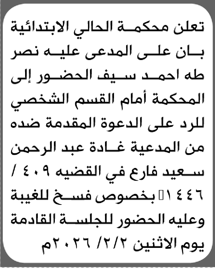 تعلن محكمة الحالي الابتدائية بأن على/ نصر طه سيف الحضور إلى المحكمة إعلاناتمحاكم On يناير 16, 2026 Share Share FacebookTwitterWhatsAppTelegramGoogle+البريد الإلكترونيPrint