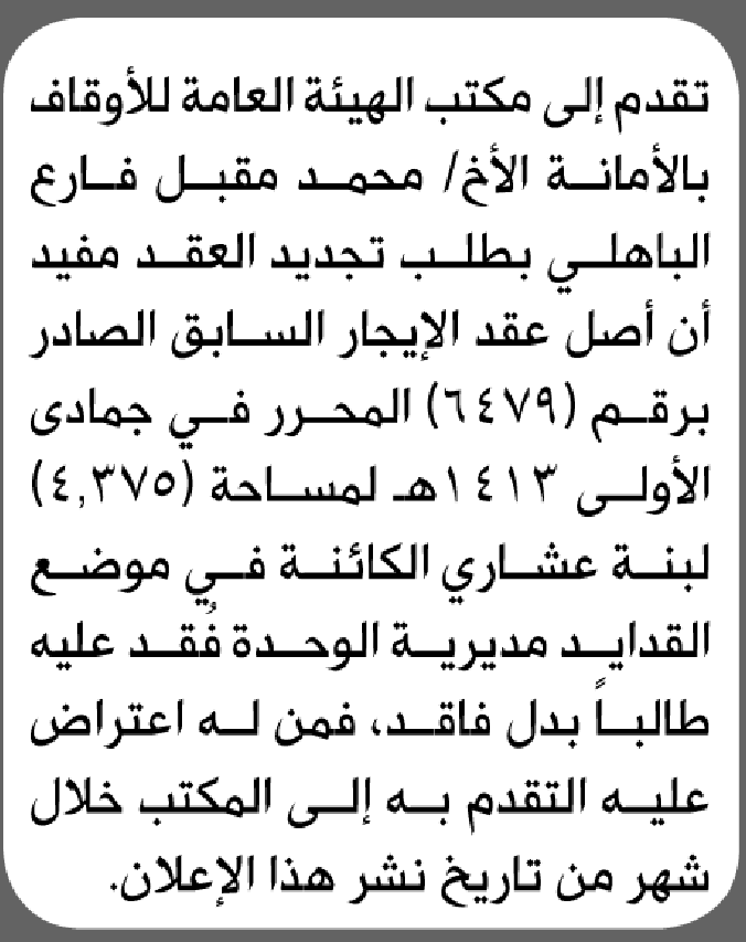 تعلن الهيئة العامة للأوقاف بالأمانة بأن الأخ/ محمد مقبل الباهلي تقدم إليها بطلب تجديد عقد الإيجار إعلاناتالسجل العقاري On يناير 17, 2026 Share Share FacebookTwitterWhatsAppTelegramGoogle+البريد الإلكترونيPrint